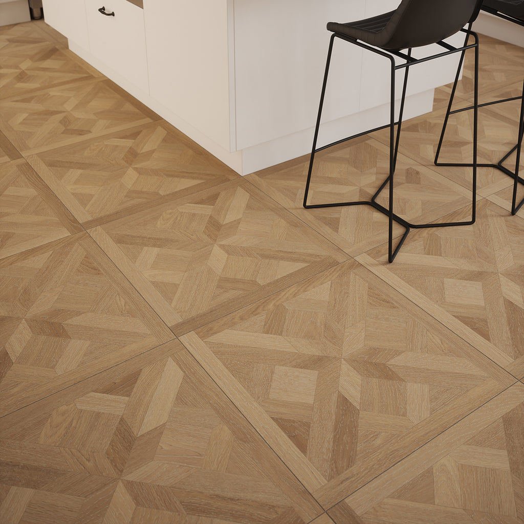 Introducing our Cavelle porcelain tile, a 60x60cm masterpiece that beautifully mimics the rustic charm of oak and walnut parquet style flooring. Crafted with state-of-the-art Dynamic HD Imaging™ inkjet printing, Cavelle boasts a lifelike wood finish complete with intricate woodgrain textures, offering a timeless touch of nature's beauty.