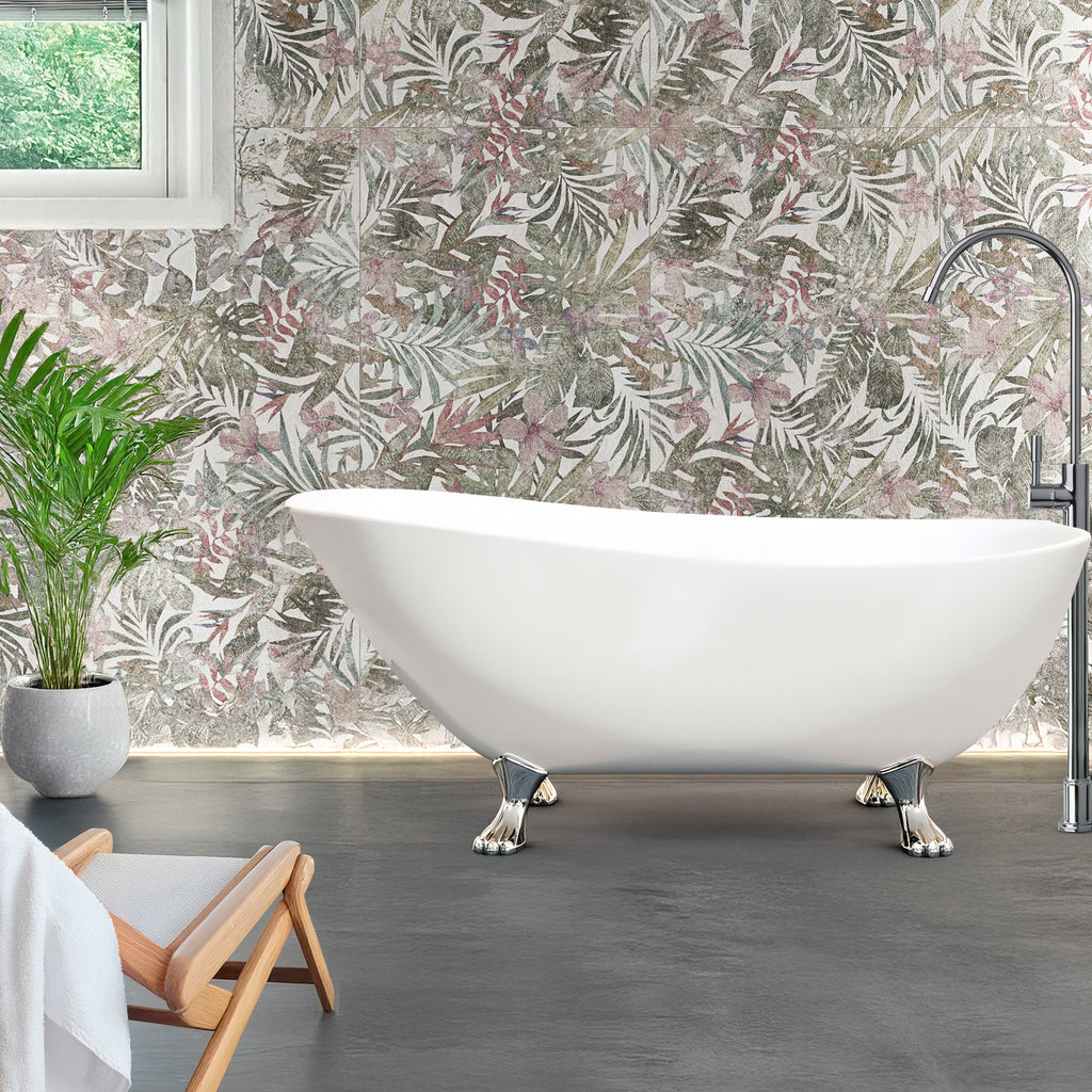 Brighten and uplift your interiors with the timeless elegance of the Flore White Tile. This beautifully crafted large-format porcelain tile features a delicate tropical floral print set against a soft white matte background, evoking a sense of calm, light, and effortless sophistication.