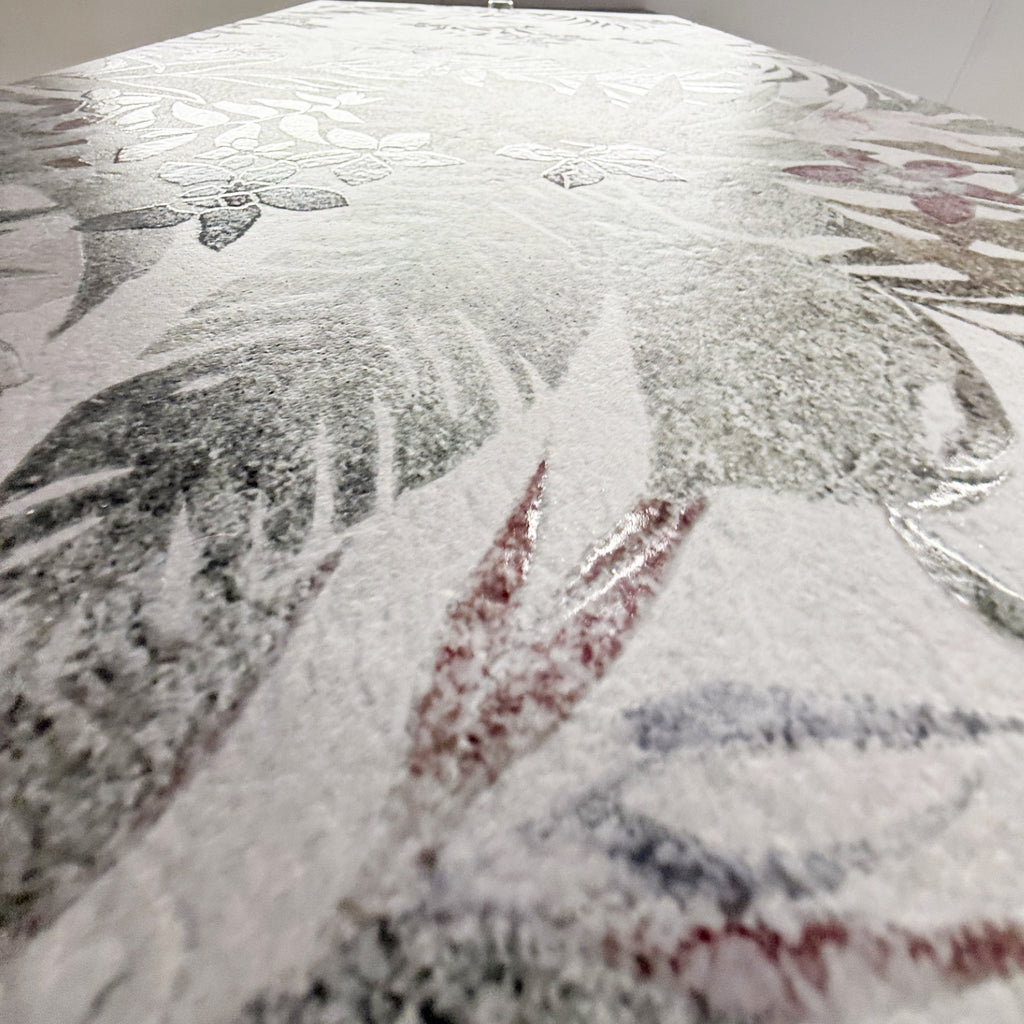 The intricate botanical design adds gentle texture and depth, while the matte finish diffuses light beautifully across the surface, creating a serene, airy atmosphere. The subtle floral detailing brings a refined natural charm, making Flore White a perfect choice for interiors that seek both tranquility and understated luxury.