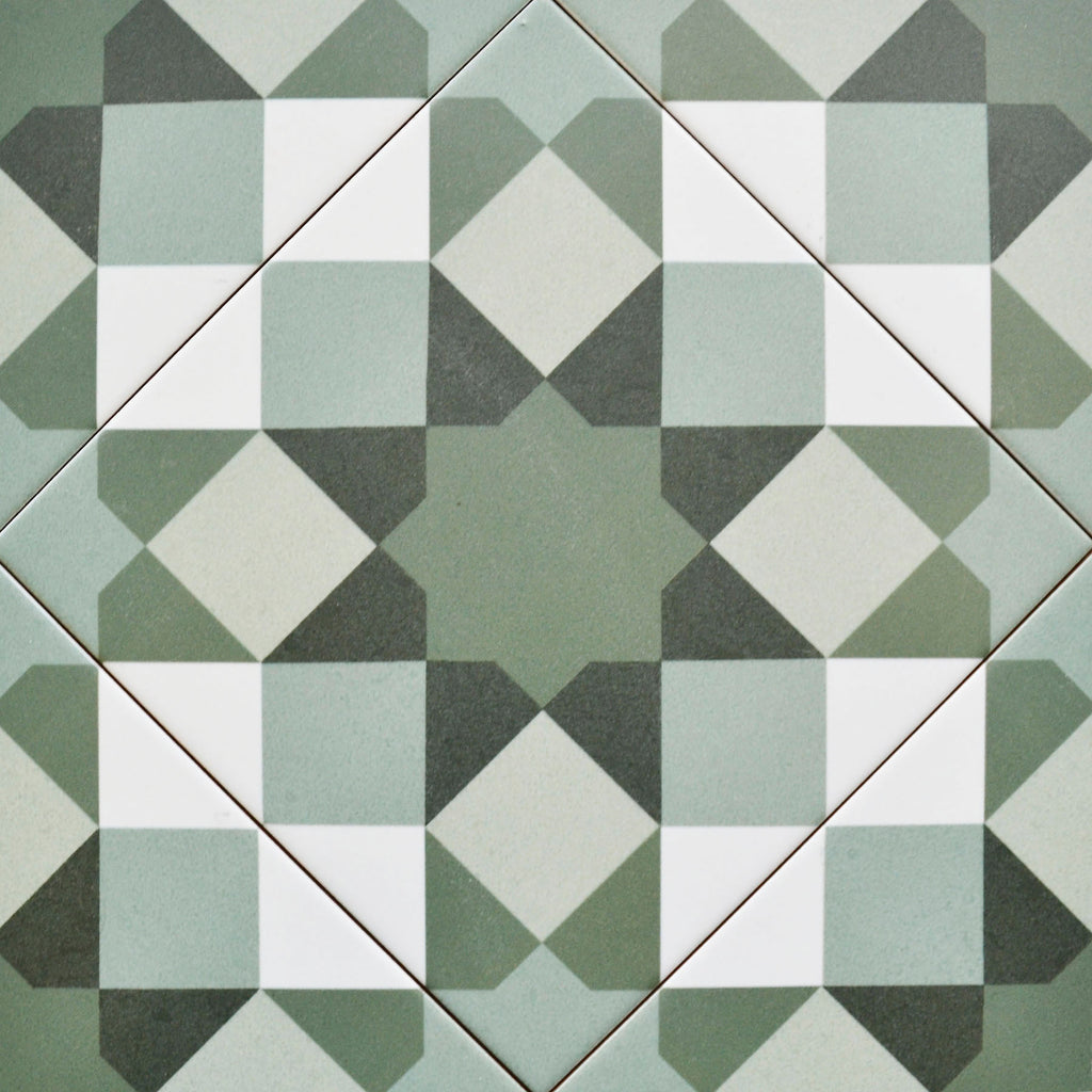 Introducing our Haywood ceramic tiles, a blend of light and dark greens with white in an intricate geometric pattern. These tiles infuse your living spaces with natural serenity and modern sophistication. With a matt finish that enhances their beauty and ensures safety, they have a slip rating of R10 and PTV36+.