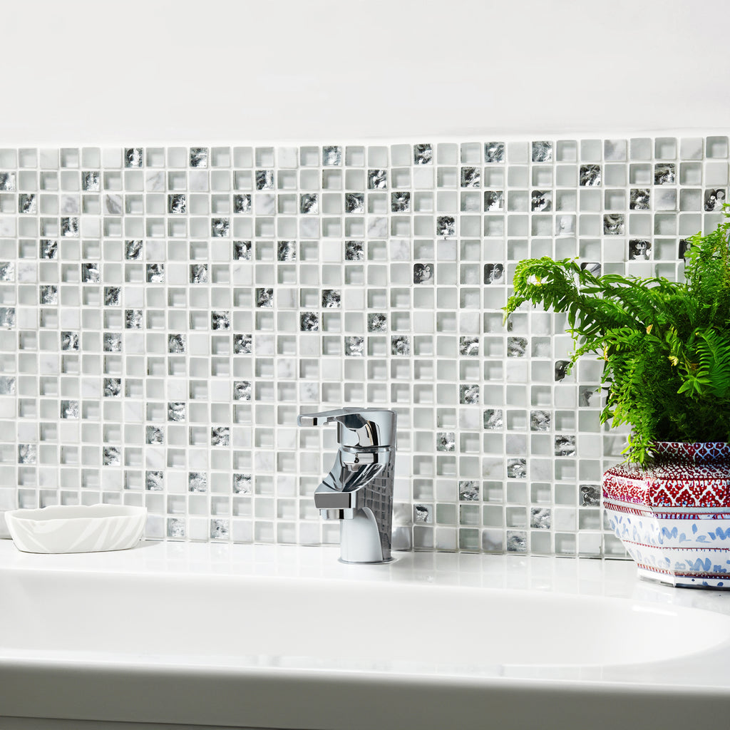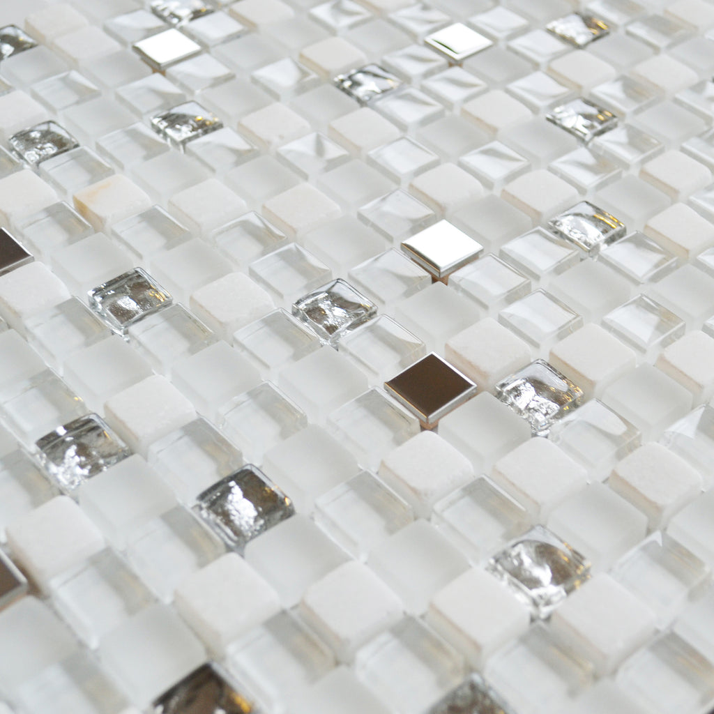 Take a look at the stunning allure of our mosaic tile with a cool and icy appearance. The combination of white mixed chips and silver metal brings a refreshing and sleek look to this luxurious mosaic. It's an excellent choice for creating a clean and fresh feel on kitchen backsplashes, bathroom walls, shower walls, and bath mirror decor.