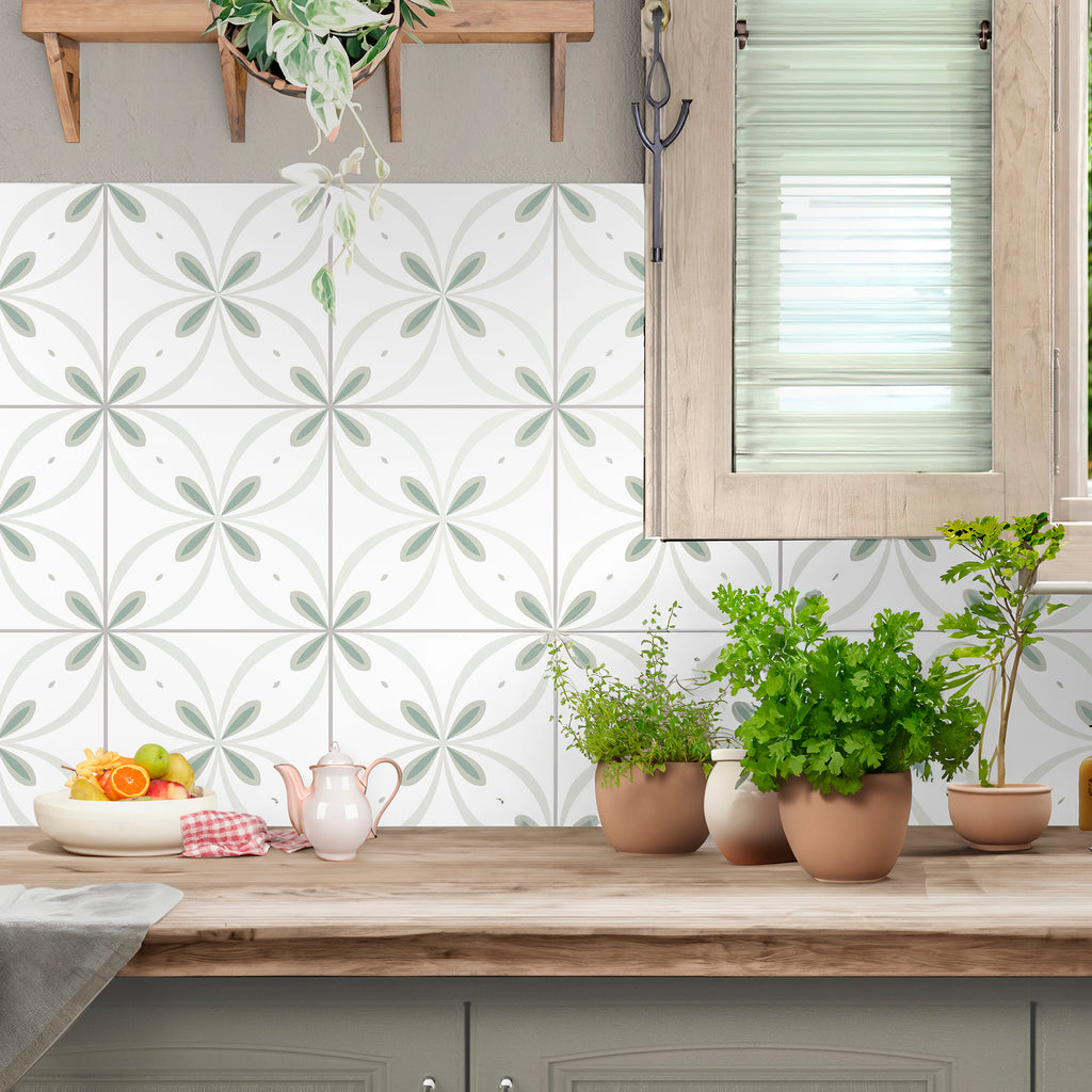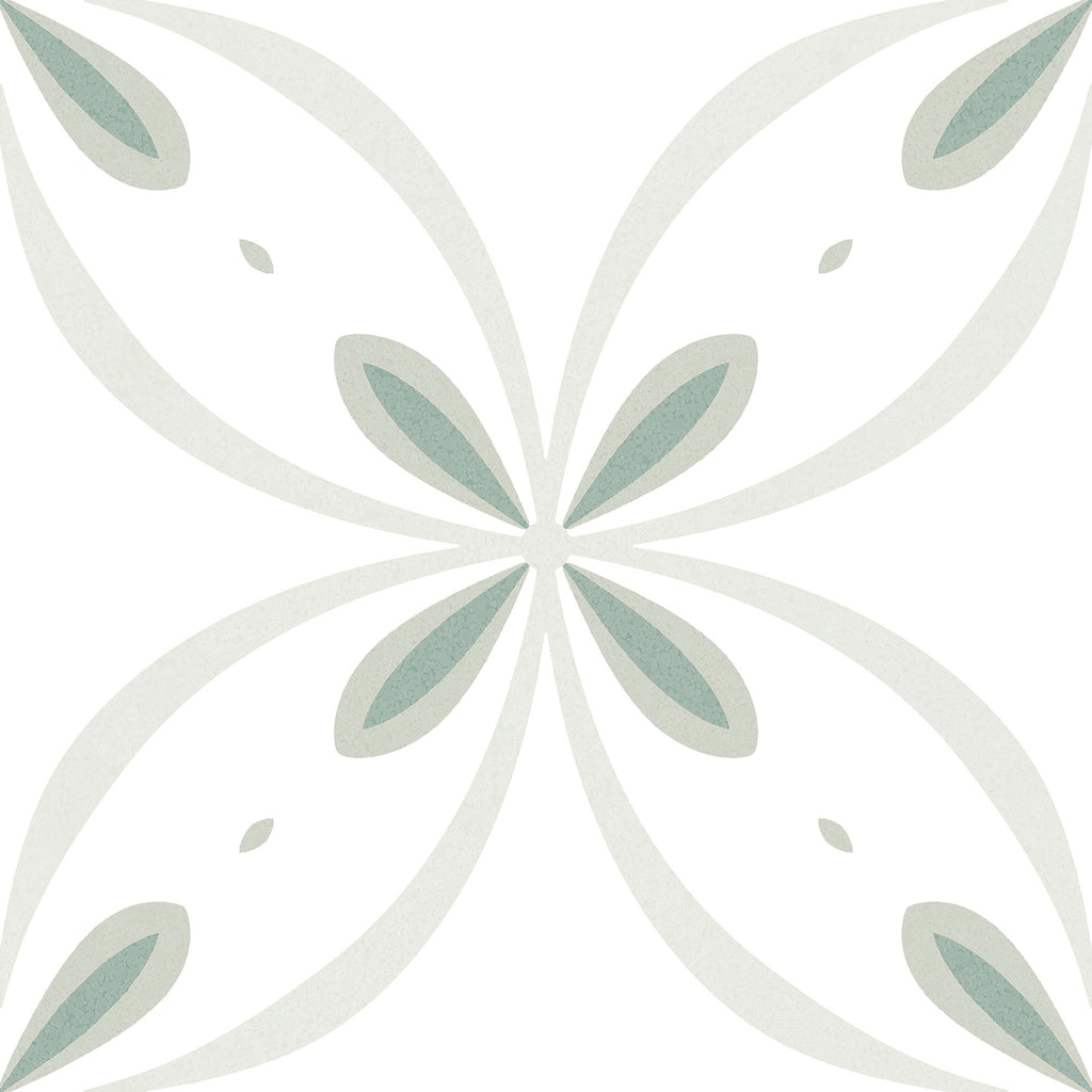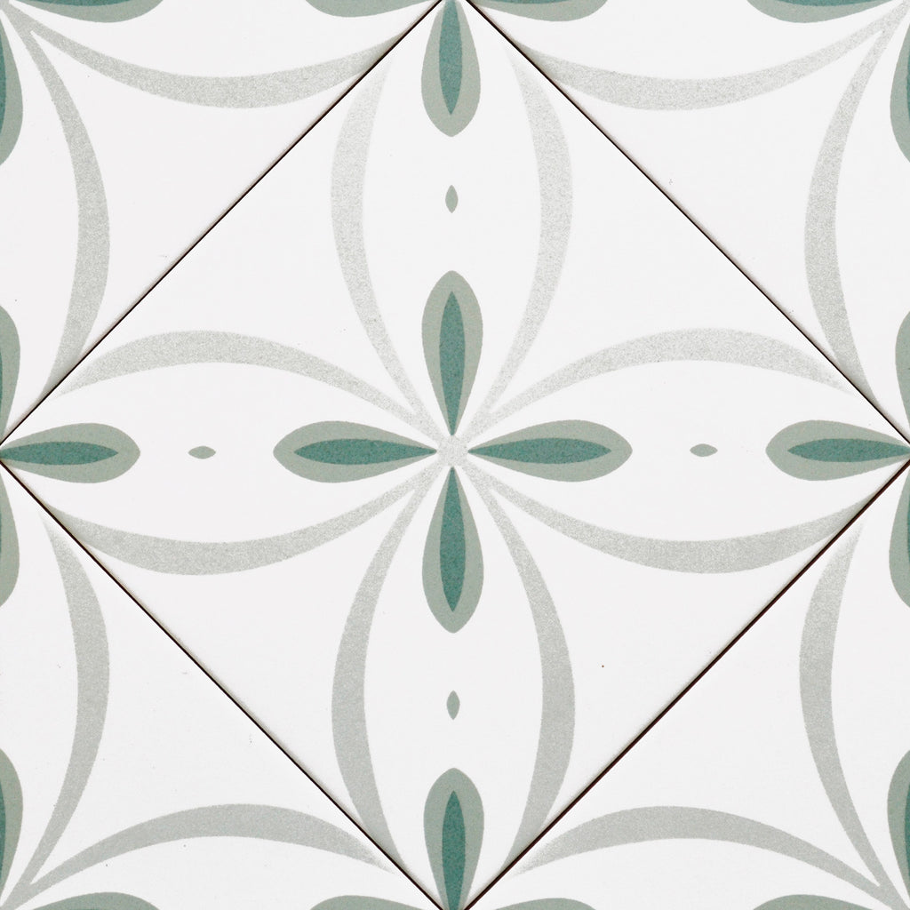 The tiles showcase a captivating pattern that seamlessly weaves together geometric shapes with delicate floral motifs, all presented in a soothing palette of dark green, light green, and pristine white. These tiles are a versatile addition to your interiors, suitable for kitchens, bathrooms, wet rooms, and en-suites, where both functionality and beauty are paramount.