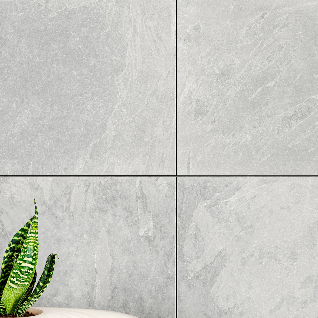 These rectified porcelain tiles feature precise edges that enable narrow joints, and when paired with complementary coloured grouts, they achieve an almost seamless visual effect.