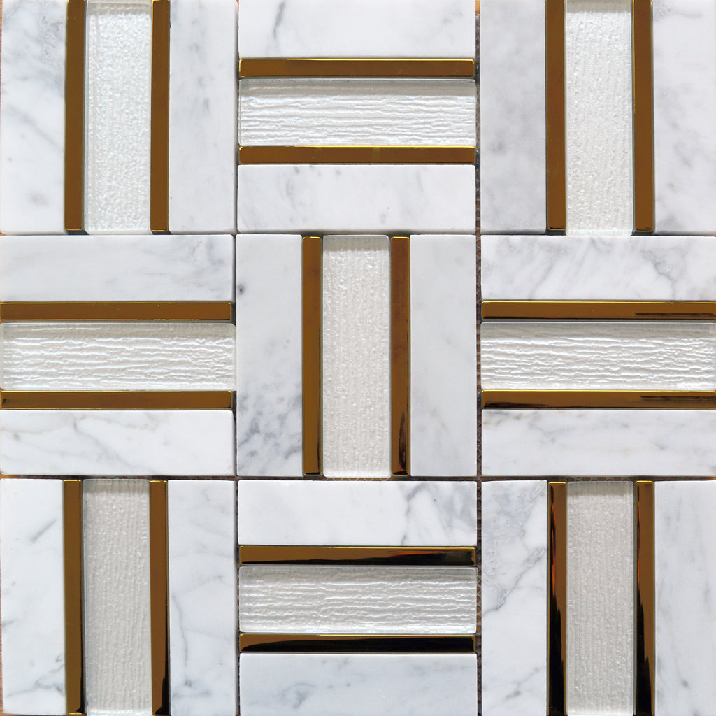 Use this mosaic to add a touch of luxury and depth to bathrooms, powder rooms, or kitchen spaces. Its layered textures and reflective accents catch the light beautifully, creating a statement that’s both elegant and contemporary.