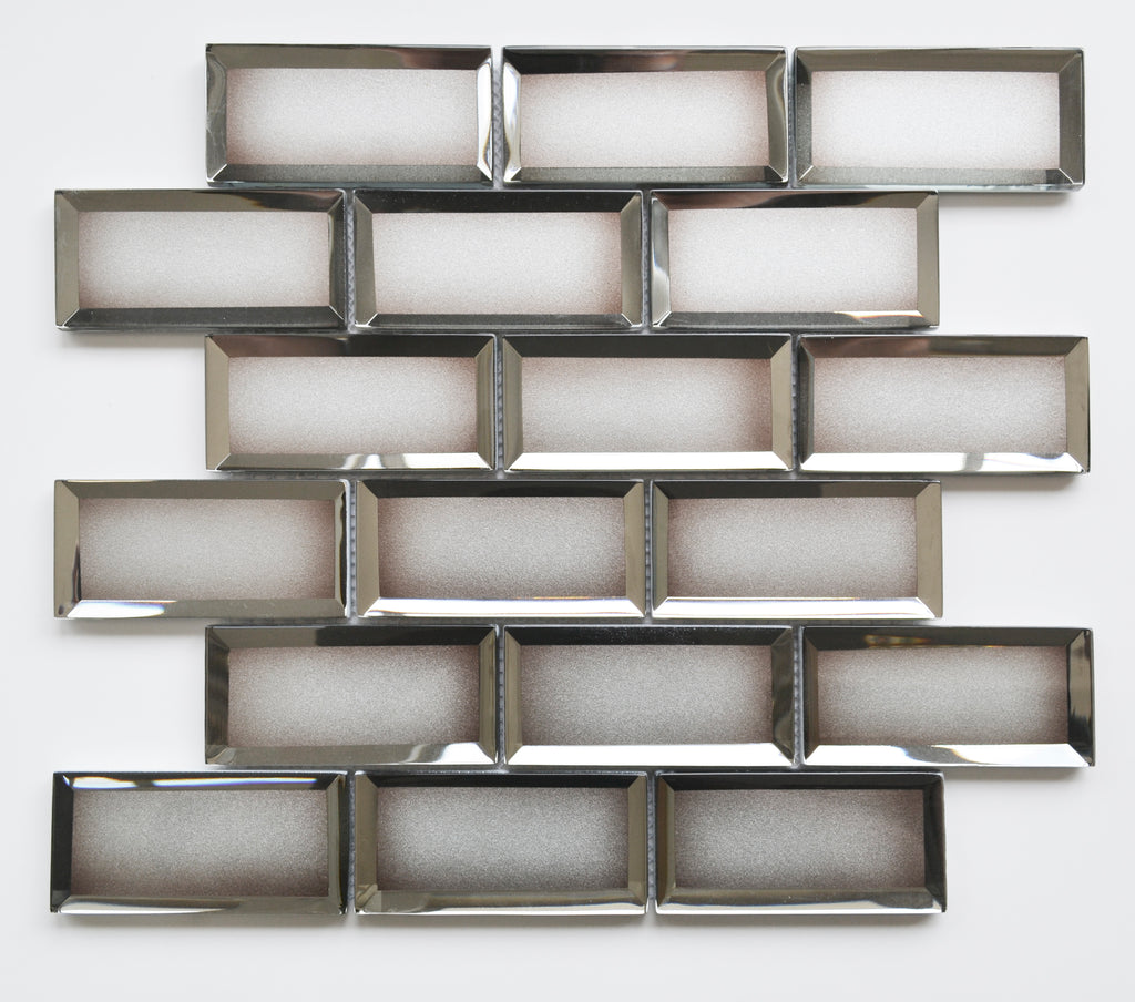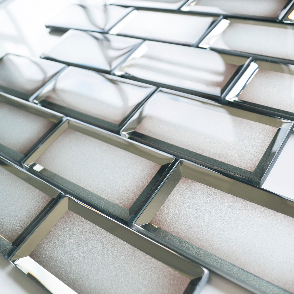The refinement of these glass brick mosaic tiles, fashioned in a striking metallic metro design, yet flaunting a smooth surface, imparts a sense of sophistication and modernity to any living space. This well-loved bevelled edge effect tile maintains its allure with its gleaming gloss finish.